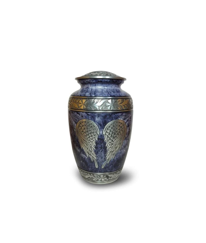 โกศโลหะทำด้วยมือที่เผาด้วยสีฟ้ามีรายละเอียดแสดงถึงสันติสุขและการเชื่อมต่อทางจิตวิญญาณอันเป็นนิรันดร์
