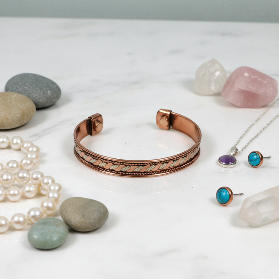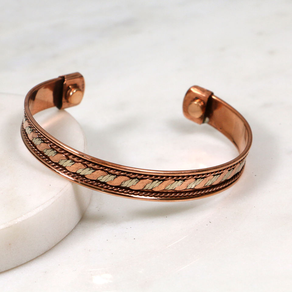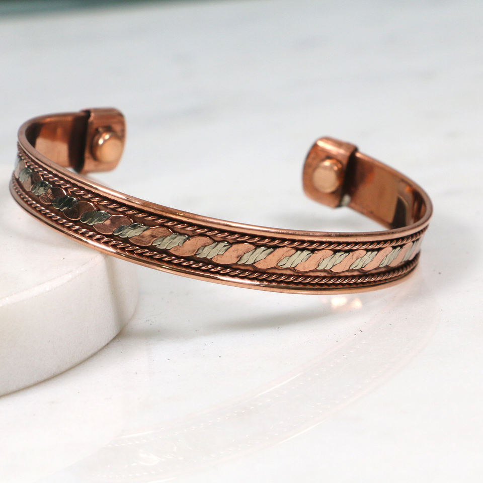 กำไลข้อมือโลหะผสมทองแดงทำมือ - กำไลแม่เหล็กบำบัดแบบปรับได้ ประดับลวดทองเหลืองและเงิน สำหรับผู้ชายและผู้หญิง