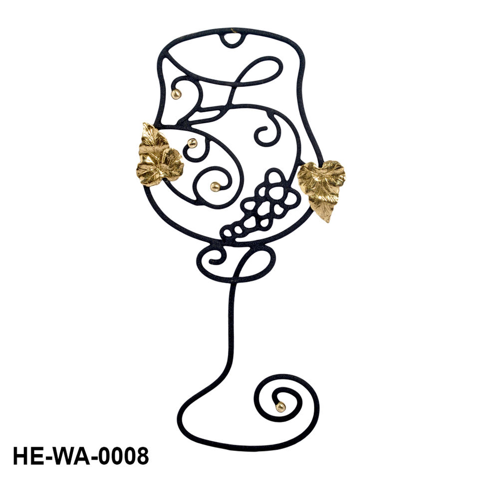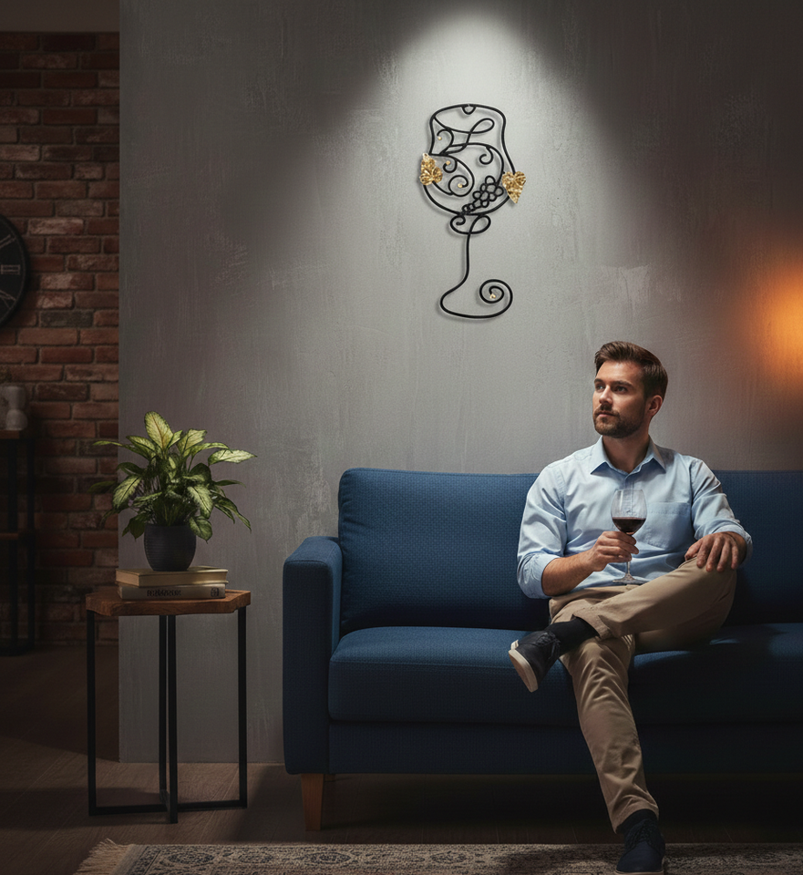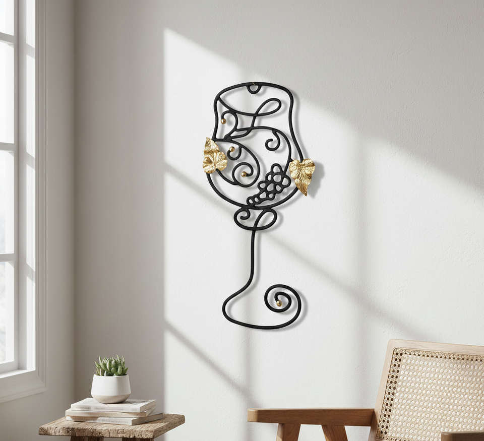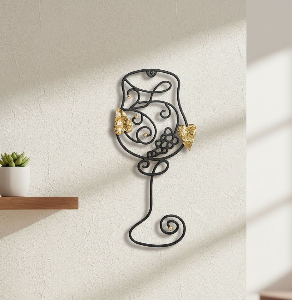 Handcrafted Modern Iron Wall Art with Hanging Function Featuring Wine Goblet and Brass-Golden Grape & Leaf Accents