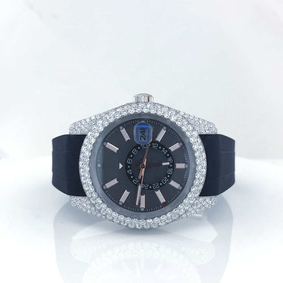 นาฬิกาข้อมือแฟชั่นหรูหราสำหรับผู้ชาย ประดับเพชรโมอิสซาไนต์ งานแฮนด์เมด หน้าปัดกระจก สายหนัง/ซิลิโคน กว้าง 20 มม. ระบบออโต้เดท สไตล์ฮิปฮอป