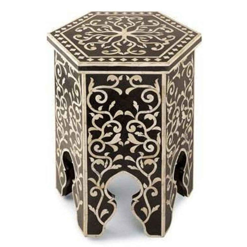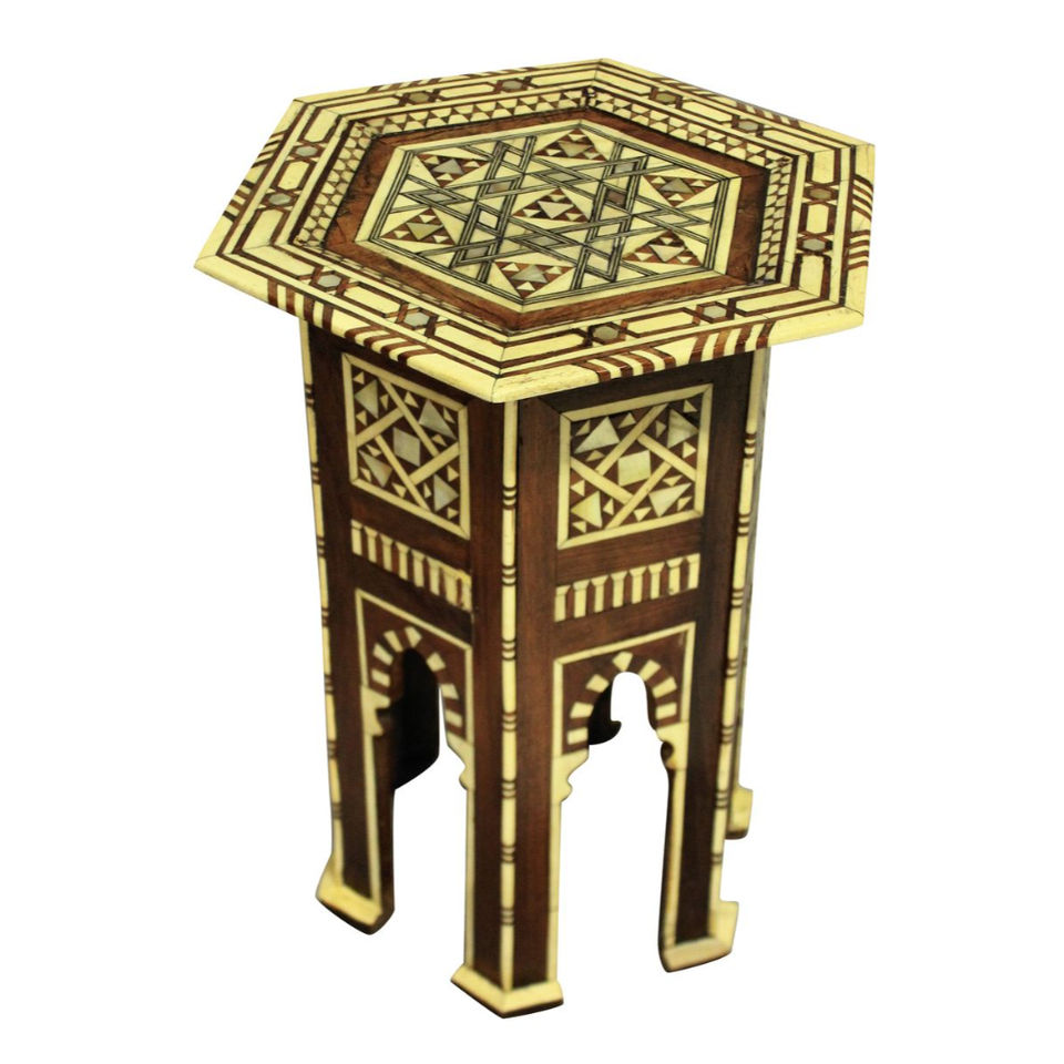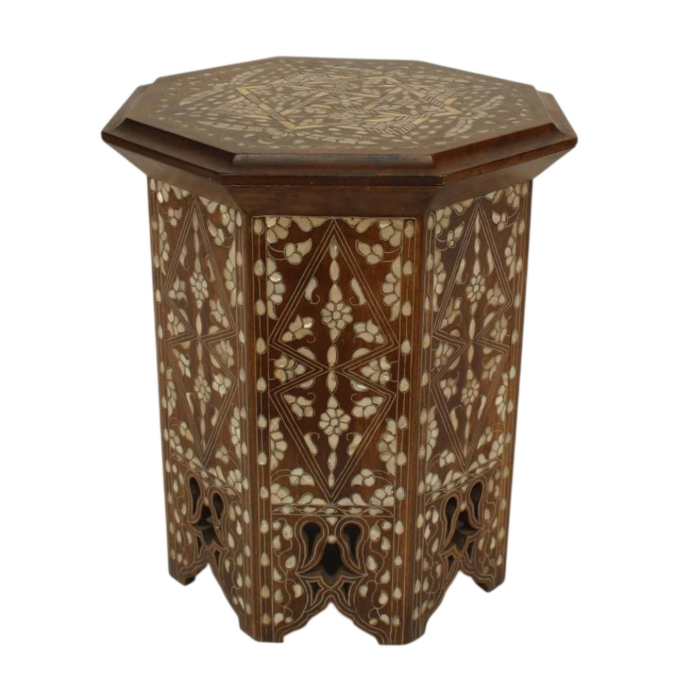 โต๊ะข้างไม้ทรงแปดเหลี่ยมสไตล์โมร็อกโกทำมือ พร้อมงานฝังมุก ตกแต่งด้วยวัสดุโบราณ แต่งลายอิสลามมุริช
