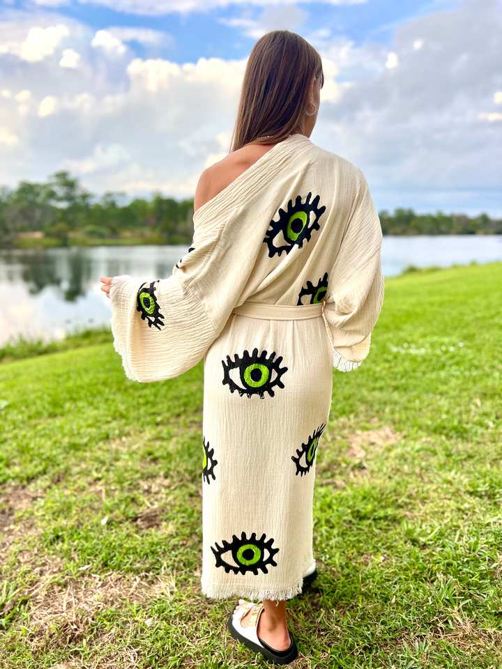 ชุดคลุมกิโมโนพิมพ์ลายทำจากผ้าฝ้ายธรรมชาติผ้าห่มแสนสบายชุดคลุมตัวยาวขอบริมแขนเสื้อแบบคลาสสิกชุดใส่อยู่บ้านหวาน