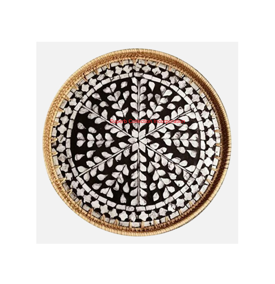 ถาดเสิร์ฟหวายธรรมชาติทำด้วยมือพร้อมเปลือกหอยมุกถาดชาผลไม้กาแฟทรงกลมเป็นมิตรกับสิ่งแวดล้อมสำหรับตกแต่งบ้าน