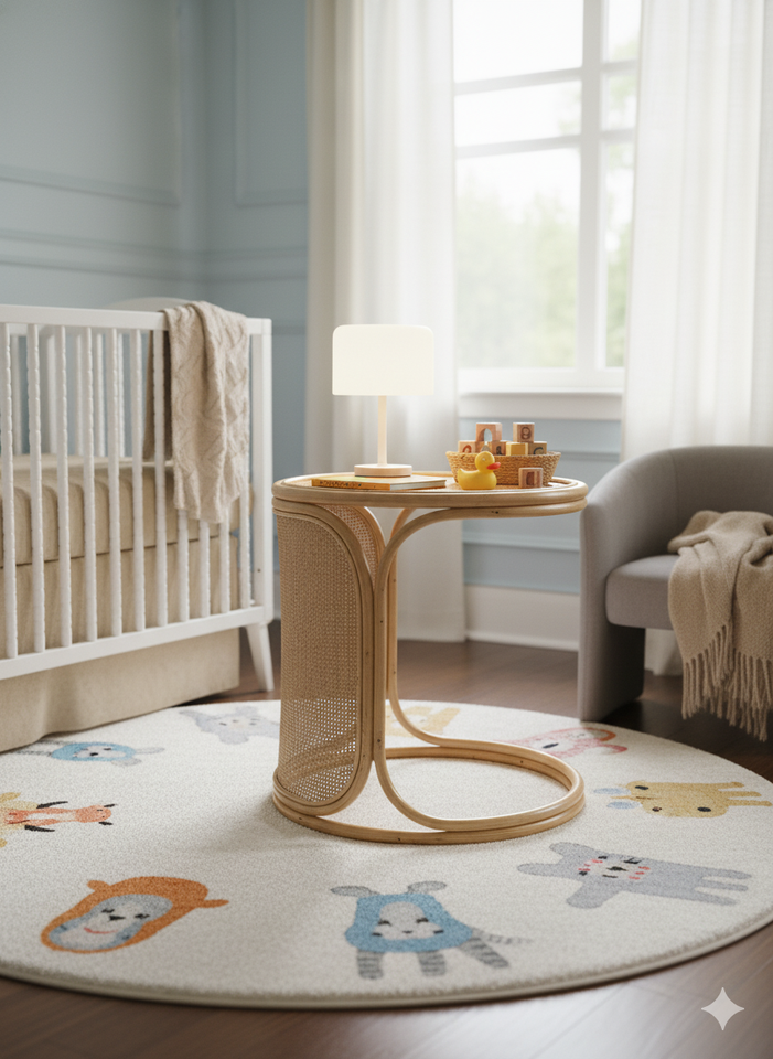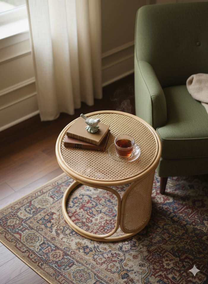 โต๊ะข้างทำจากหวายธรรมชาติทำด้วยมือโต๊ะกลมเน้นไม้เท้าสำหรับห้องนั่งเล่นหรือห้องนอน