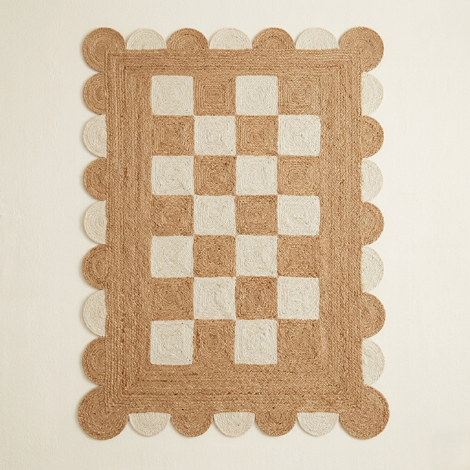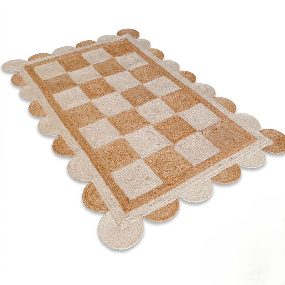 พรมปอกระเจาสีกลางทำด้วยมือพรมสี่เหลี่ยมสี่เหลี่ยมสีขาวและสีเบจพร้อมดีไซน์ขอบวงกลมสำหรับห้องนั่งเล่น