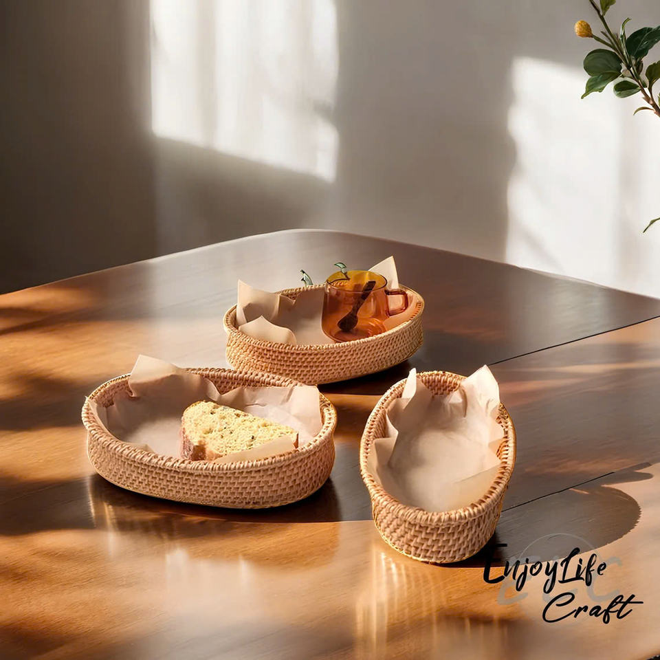ตะกร้าหวายสานทรงรีทำด้วยมือสำหรับวางบนโต๊ะสำหรับขนมปังผลไม้ขนมถั่วของขวัญขึ้นบ้านใหม่