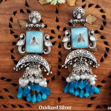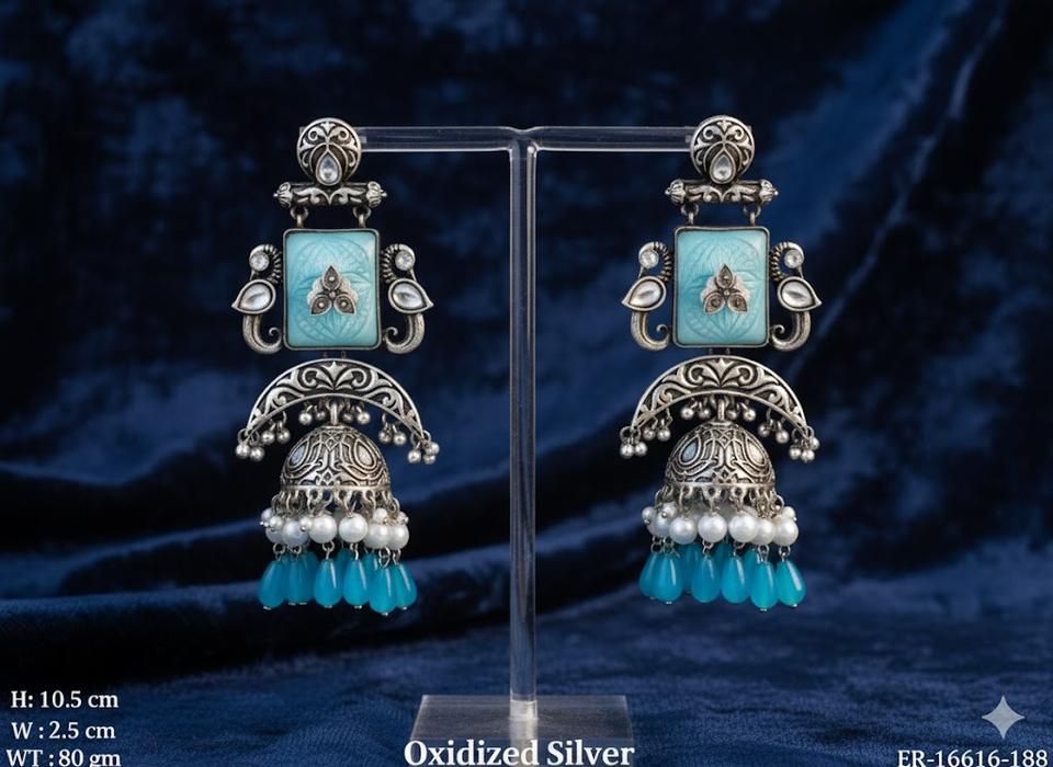 Jhumkas สีเงินงานออกซิไดซ์ที่ทำด้วยมือพร้อมการแกะสลักดอกไม้ที่ซับซ้อนเหมาะสำหรับงานแต่งงานและงานปาร์ตี้