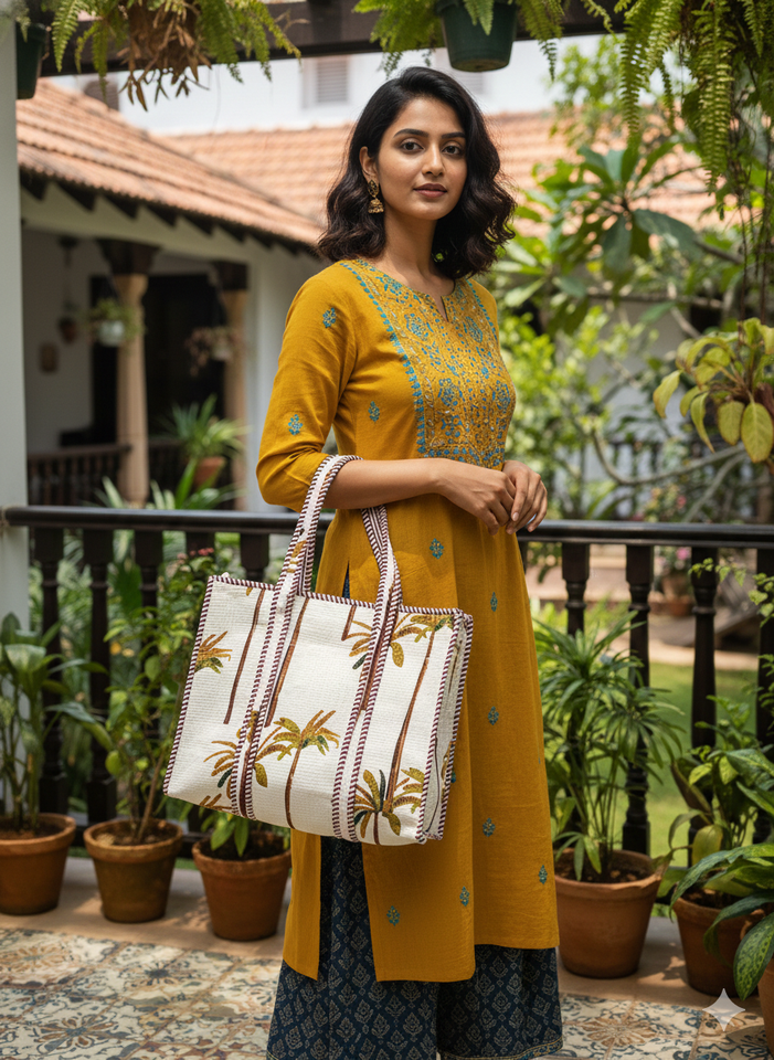 กระเป๋าโท้ทผ้าฝ้ายลายต้นปาล์มทำมือ พรีเมียม ลายทรอปิคอล กระเป๋าสะพายไหล่สไตล์ชาติพันธุ์สำหรับผู้หญิง ความจุขนาดใหญ่ เปิดได้