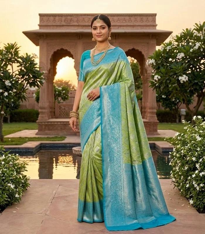 ผ้าไหมทอมือลายดอกไม้สีเขียวอนันท์ห์สีน้ำเงิน ผ้าซารีไหมทอมือสำหรับผู้หญิง แบบดั้งเดิมจากกันชีปุรัม สำหรับงานแต่งงาน งานเลี้ยง งานพิธีแบบดั้งเดิม
