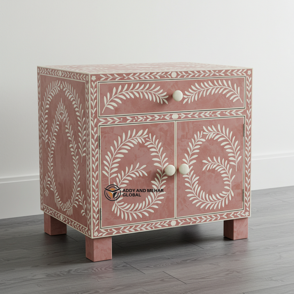 โต๊ะข้างทรงกลองลายดอกไม้ฝังกระดูกสีชมพูขาว งานแฮนด์เมด สำหรับห้องนั่งเล่นและห้องนอน