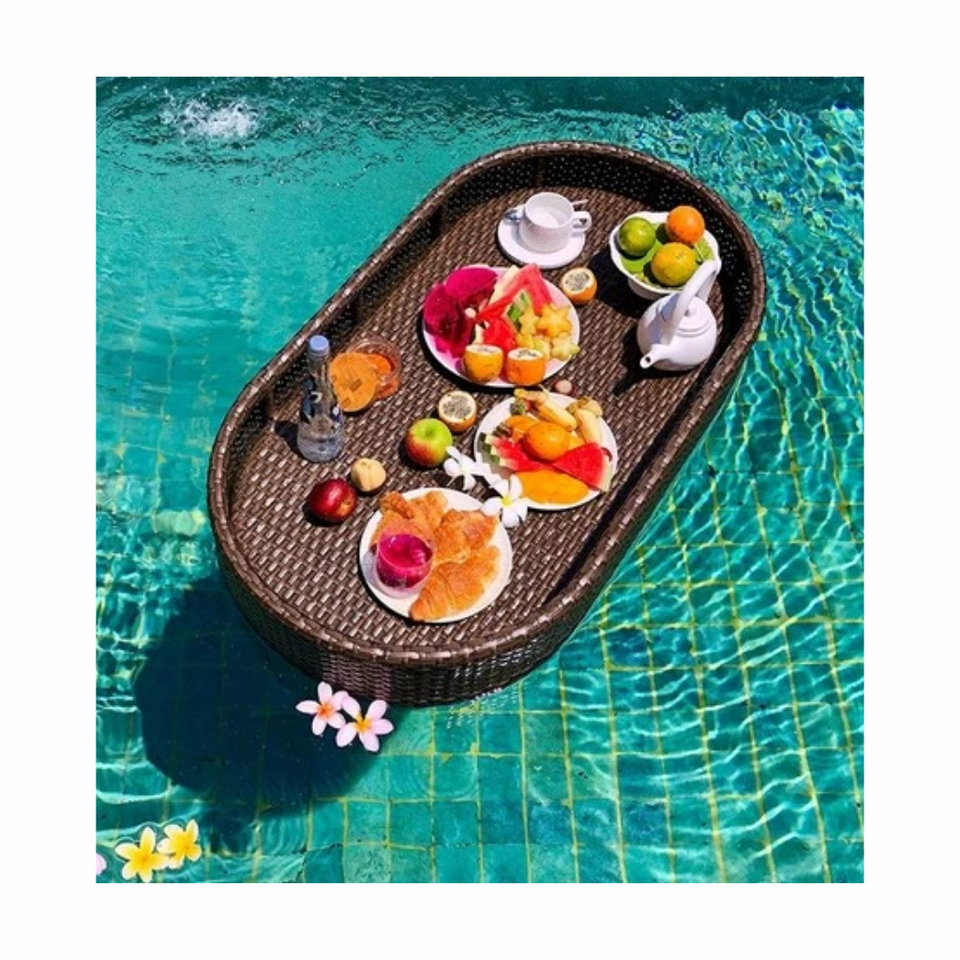ถาดหวายลอยน้ำที่ทำด้วยมือสำหรับการพักผ่อนบนชายฝั่ง: เหมาะสำหรับเก็บอาหารและค็อกเทลระหว่างปิกนิกริมชายหาดหรือเขตร้อน