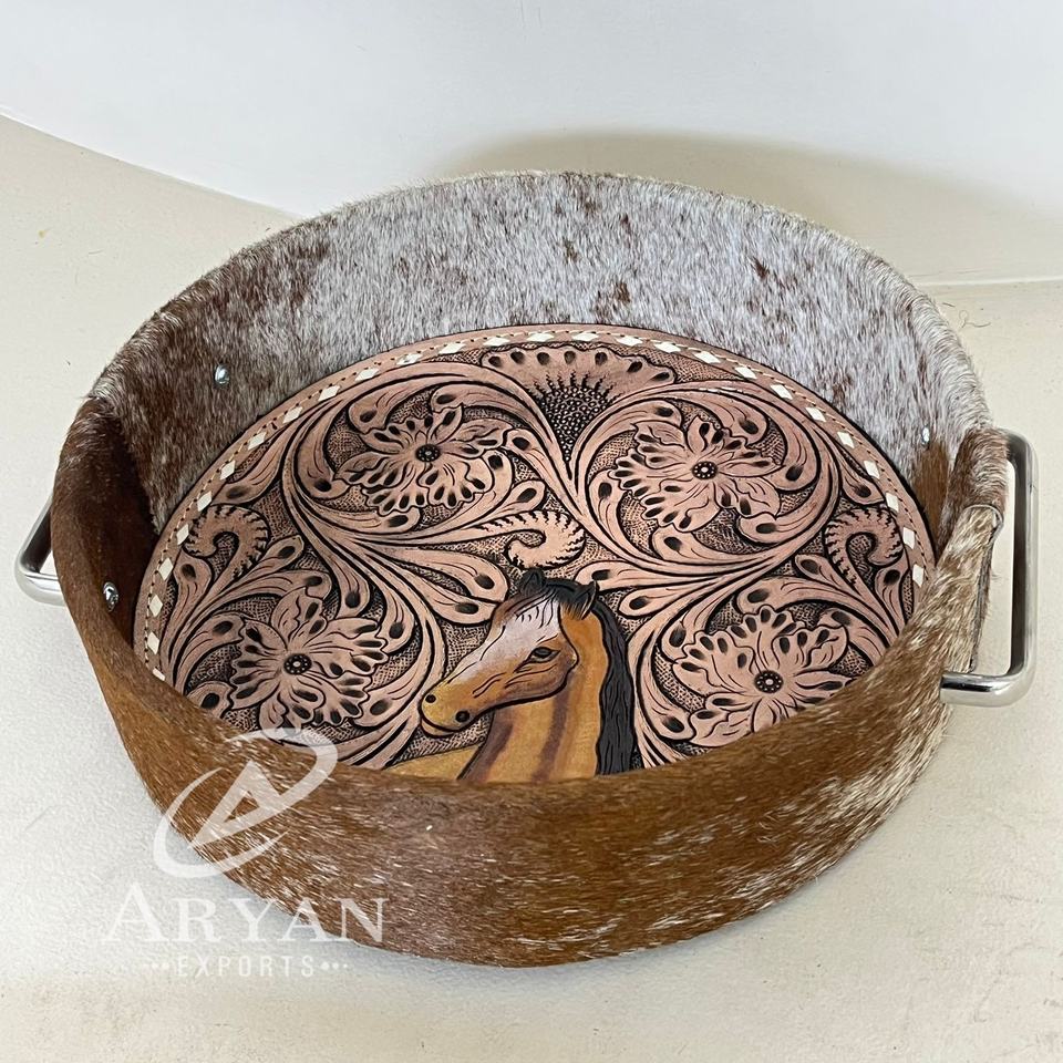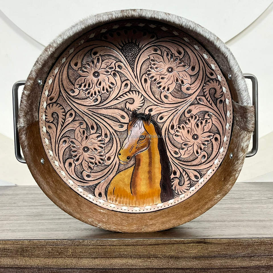 ถาดเสิร์ฟกลมหนังวัวแท้ทำด้วยมือพร้อมเครื่องมือดีไซน์รูปม้าดอกไม้ถาดหนังสไตล์ตะวันตกแบบชนบทพร้อมที่จับ