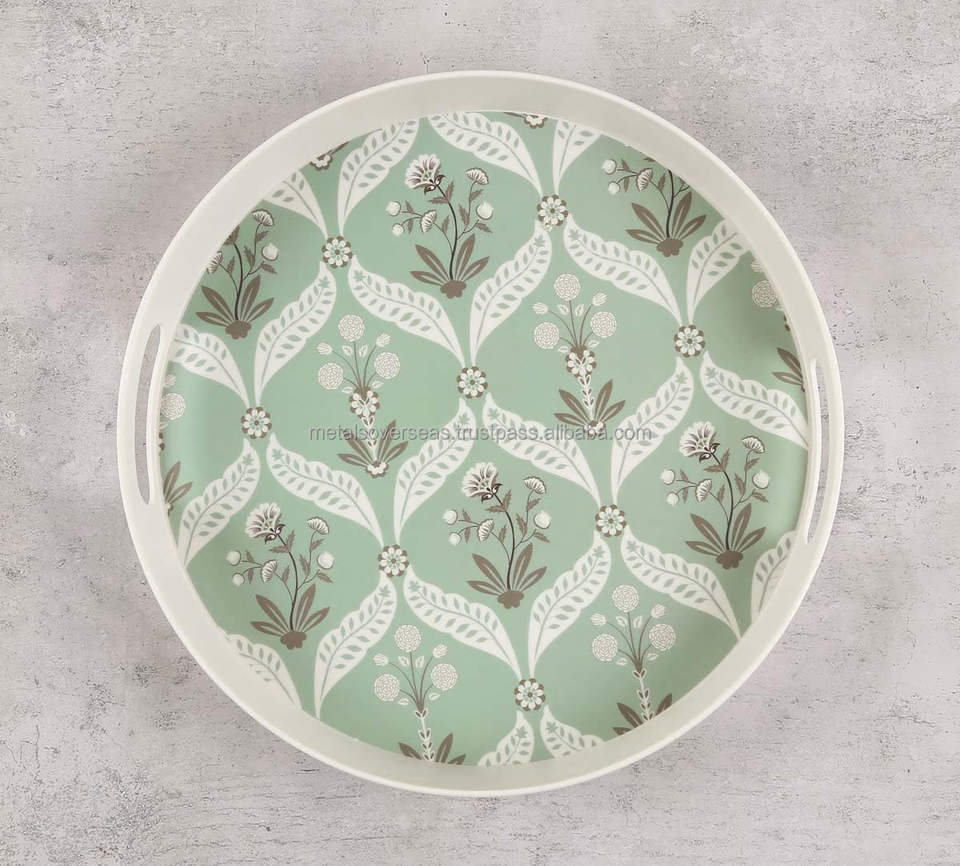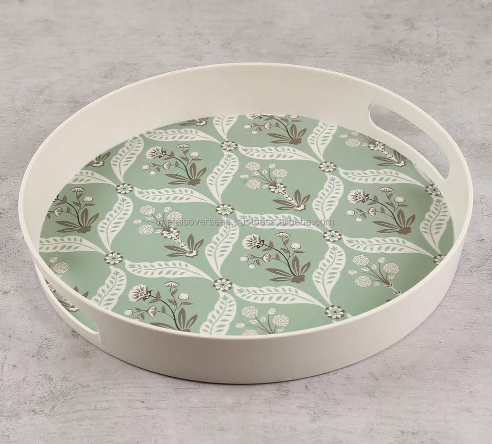 ถาดเสิร์ฟไม้ไผ่ทรงกลมทำด้วยมือพร้อมพิมพ์ลายใบไม้เขตร้อนสำหรับห้องนอนห้องนั่งเล่นและตกแต่งห้องรับประทานอาหาร