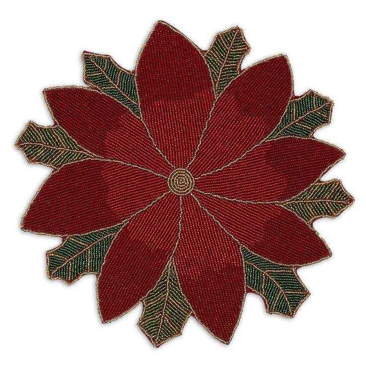 แผ่นรองจานลายดอกโป๊ยเซียนทำมือจากลูกปัดแก้วทรงกลม พื้นหลังสีขาว ลายสีแดงเขียว สำหรับโต๊ะอาหารคริสต์มาส