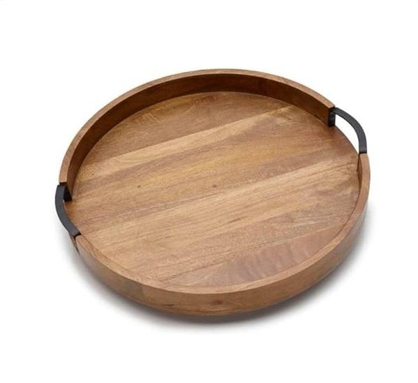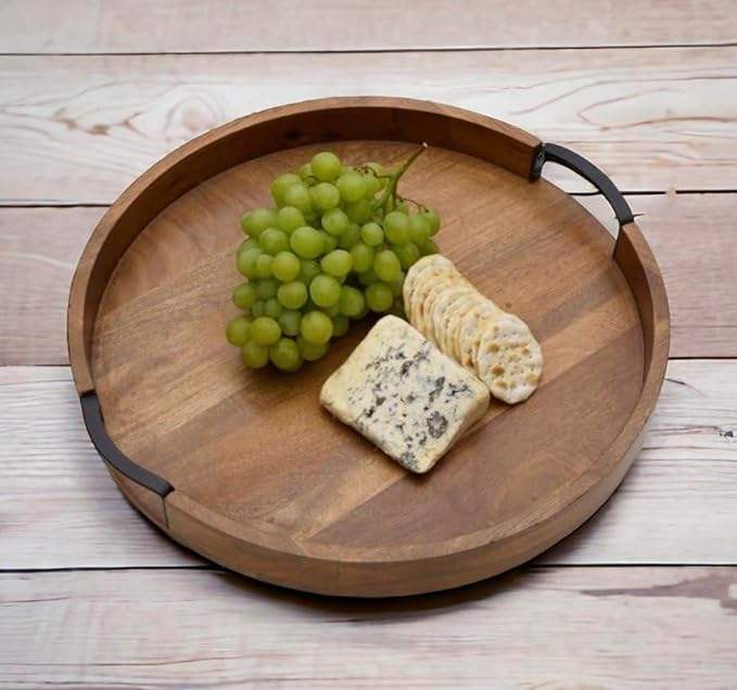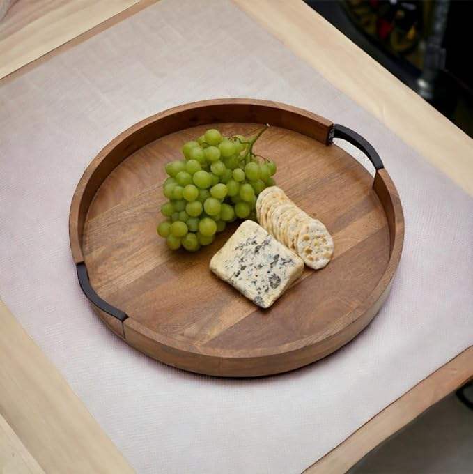 ถาดเสริฟไม้ทรงกลมแฮนด์เมดพร้อมที่จับเหล็กขนาดกลาง 11" x 11" x 1.5" - ถาดกาแฟธรรมชาติตกแต่ง MZ