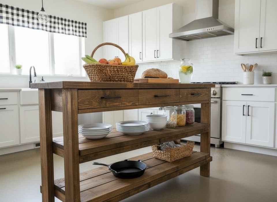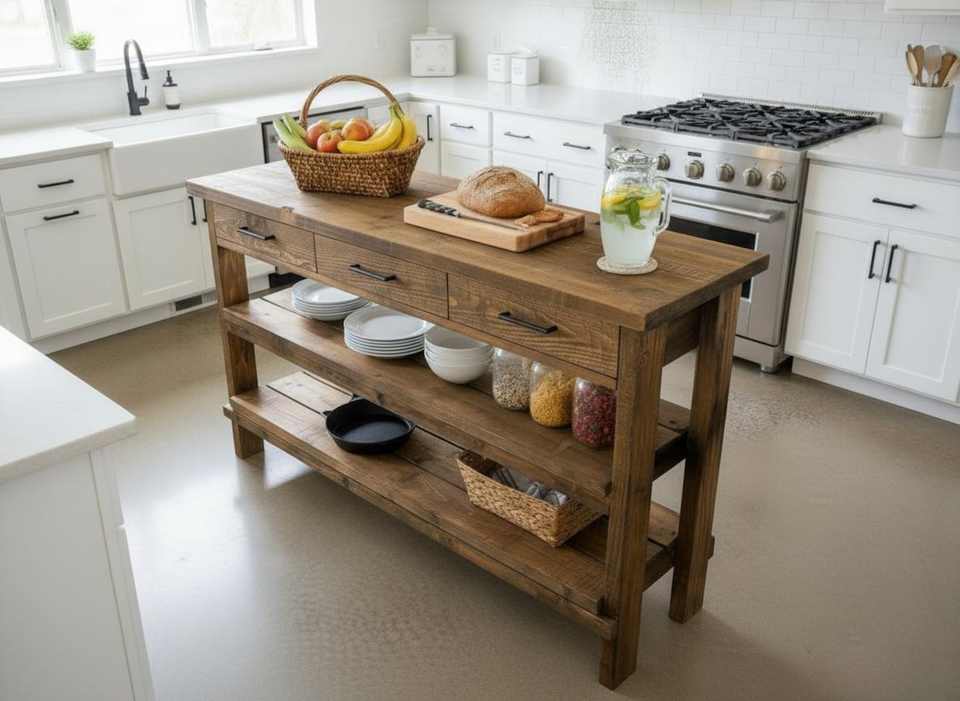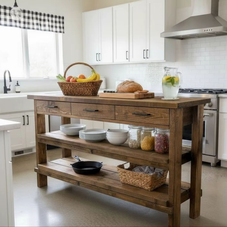 โต๊ะครัวไม้สไตล์ชนบททำมือ พร้อมลิ้นชักสามช่อง ชั้นวางสองชั้นกว้างขวาง และไม้เนื้อแข็งหนา