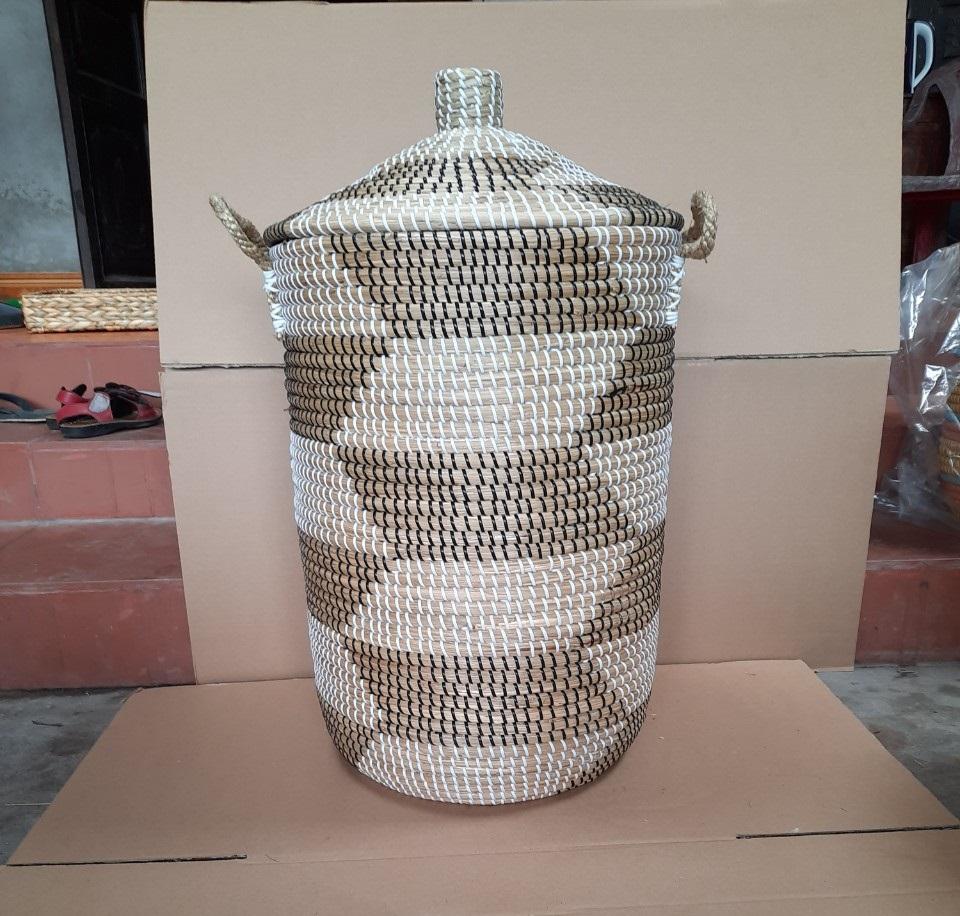 ตะกร้าซักผ้าทำจากหญ้าทะเลทำด้วยมือตะกร้าเก็บของสีสันสดใสแบบชนบทและยั่งยืนสำหรับการจัดระเบียบบ้านที่ผลิตในเวียดนาม