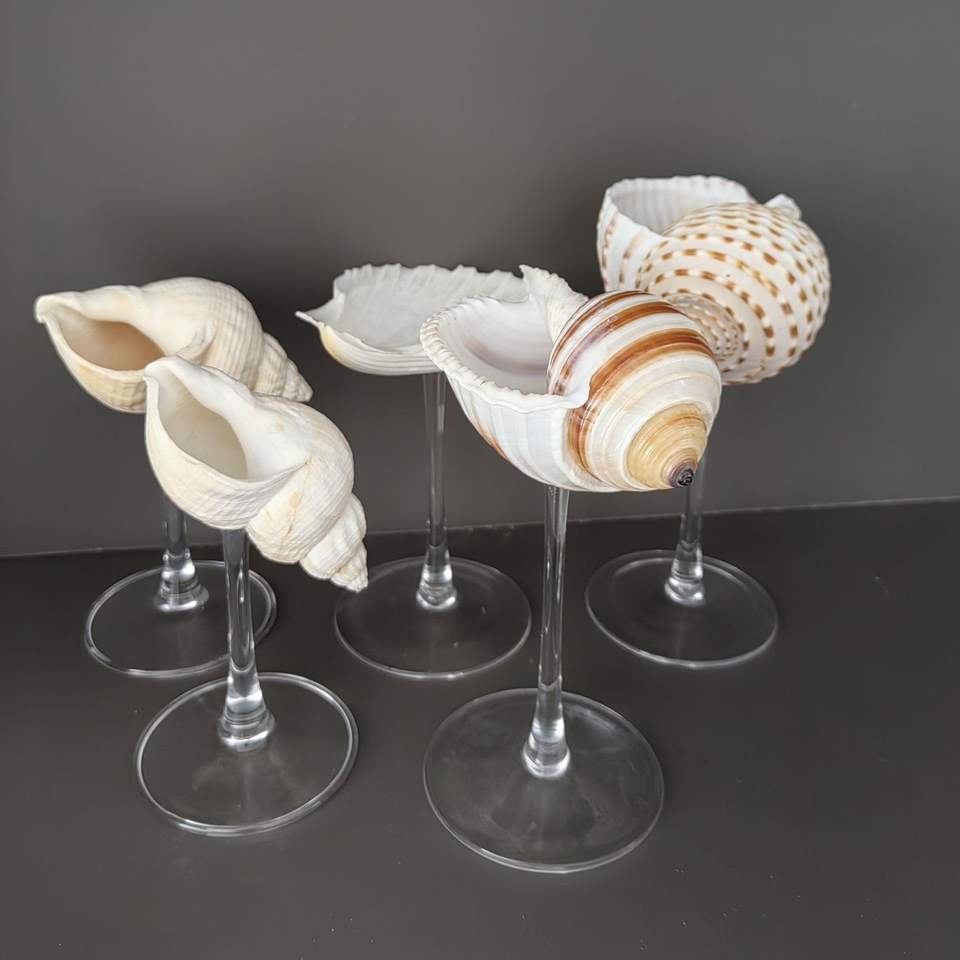 แก้วไวน์เปลือกหอยทำด้วยมือและถ้วยแก้วที่มีรูปแบบเปลือกหอยสำหรับการแสดงโต๊ะปาร์ตี้ชายหาด