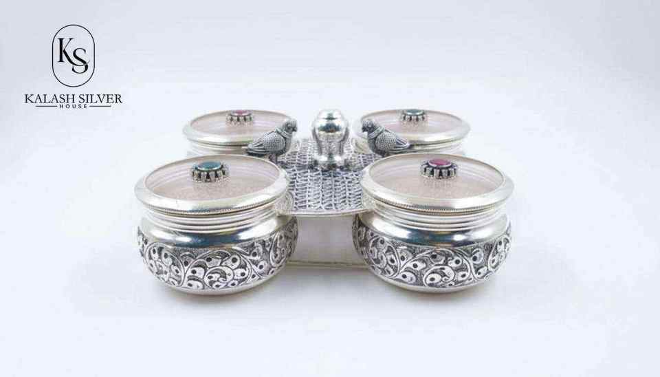 ชุดภาชนะใส่ผลไม้อบแห้งทำจากเงินแท้ งานฝีมือ พร้อมชามสี่ใบและฐานวางดีไซน์สวยงาม สำหรับตกแต่งบ้านและเป็นของขวัญ