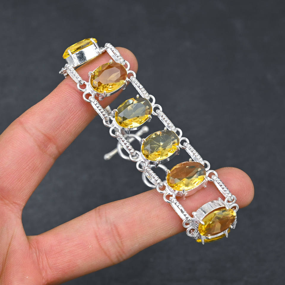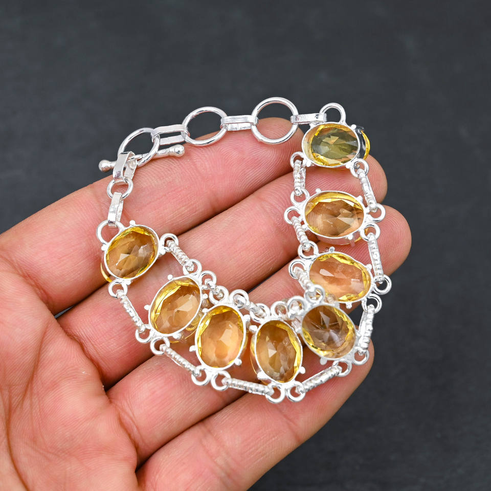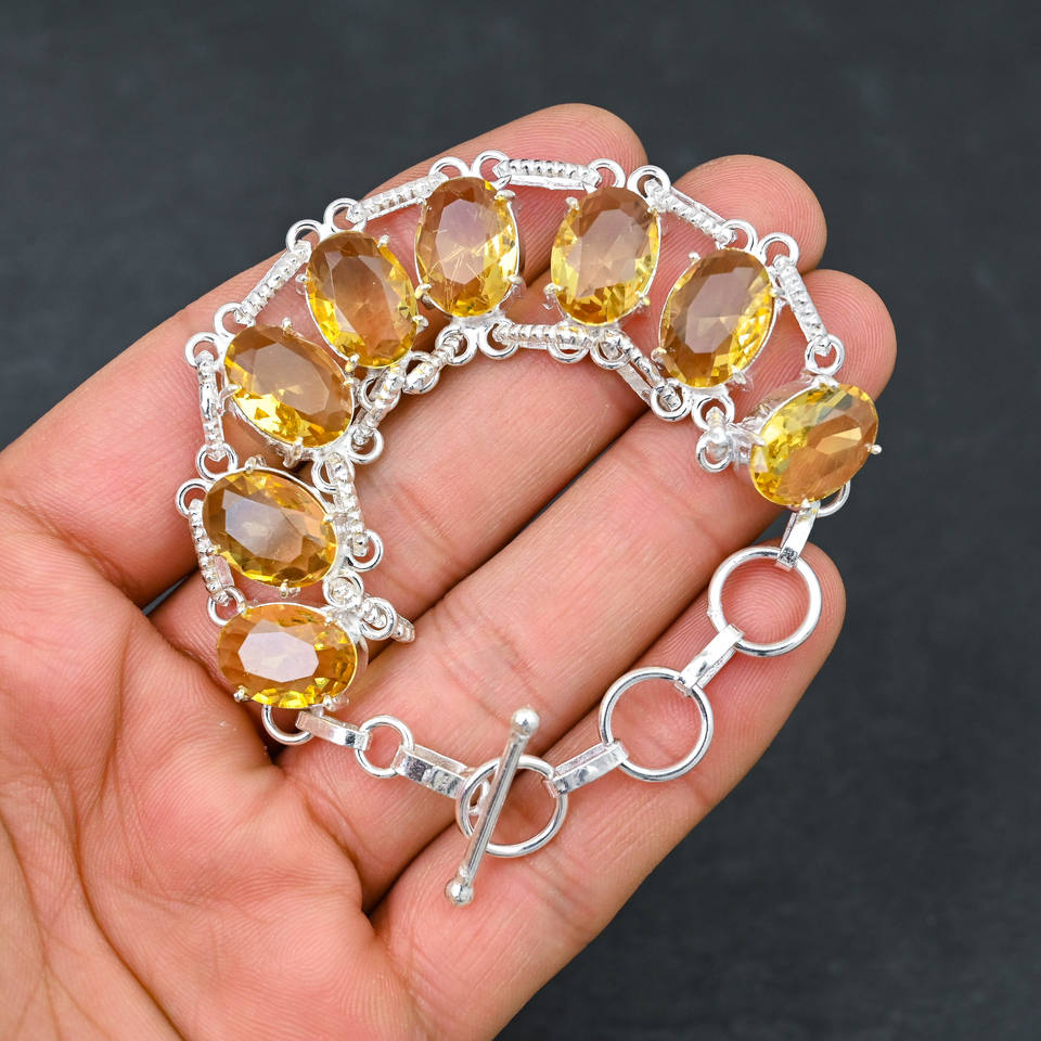สร้อยข้อมือชุบเงินทำมือพร้อมวงรี8อันขนาด10X14มม. หินซิทรินสีเหลืองของขวัญที่เหมาะสำหรับผู้หญิง
