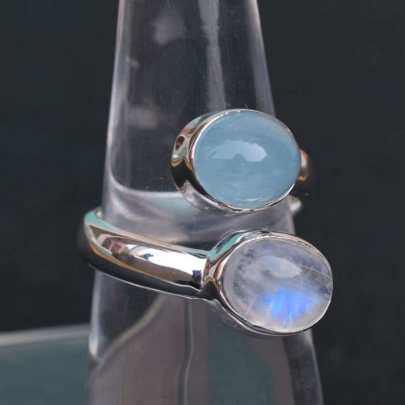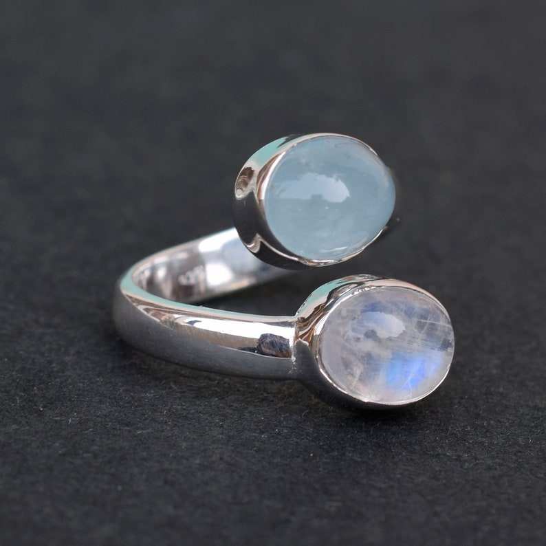 แหวนเงินแบบปรับได้สไตล์เปิดทำมือของผู้หญิงที่มีเครื่องประดับพลอยสีน้ำเงินพลอยสีขาวธรรมชาติกระตุ้นด้วยความร้อน