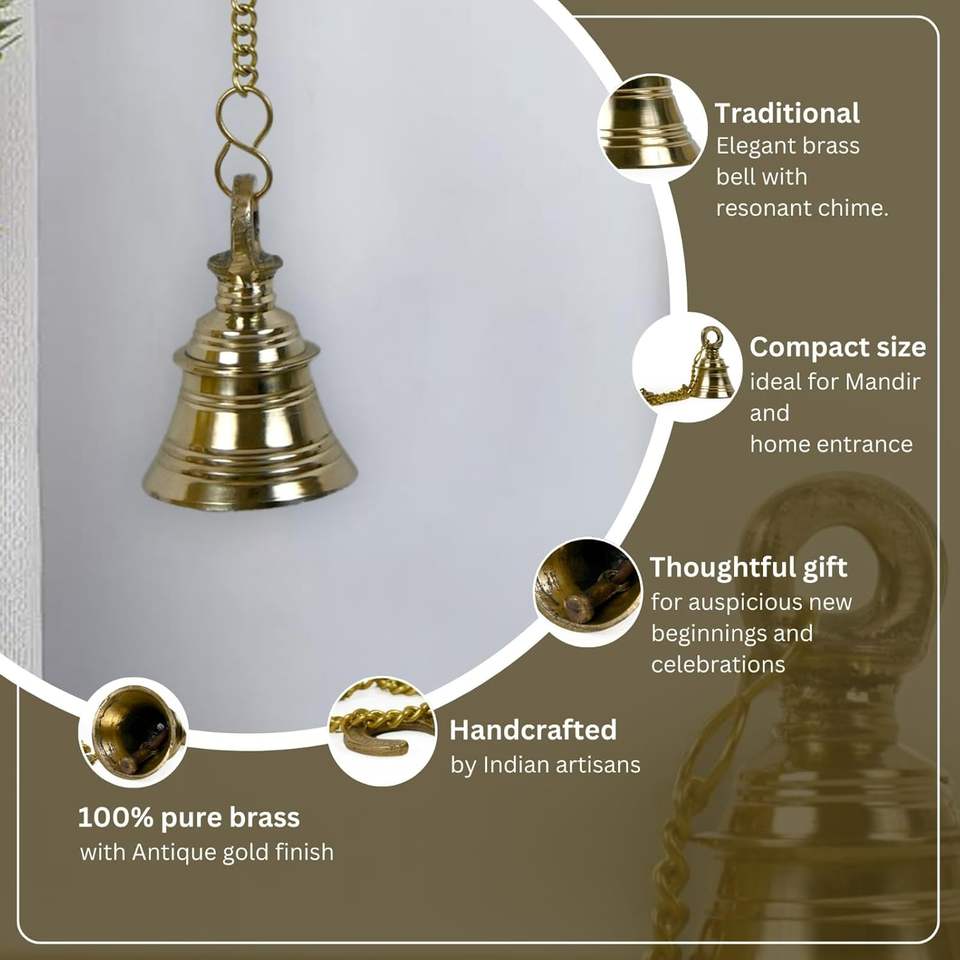 กระดิ่งทำด้วยมือทำจากทองเหลืองพร้อมโซ่สำหรับพิธีกรรมฮินดูสตูดิโอโยคะและศูนย์นั่งสมาธิ