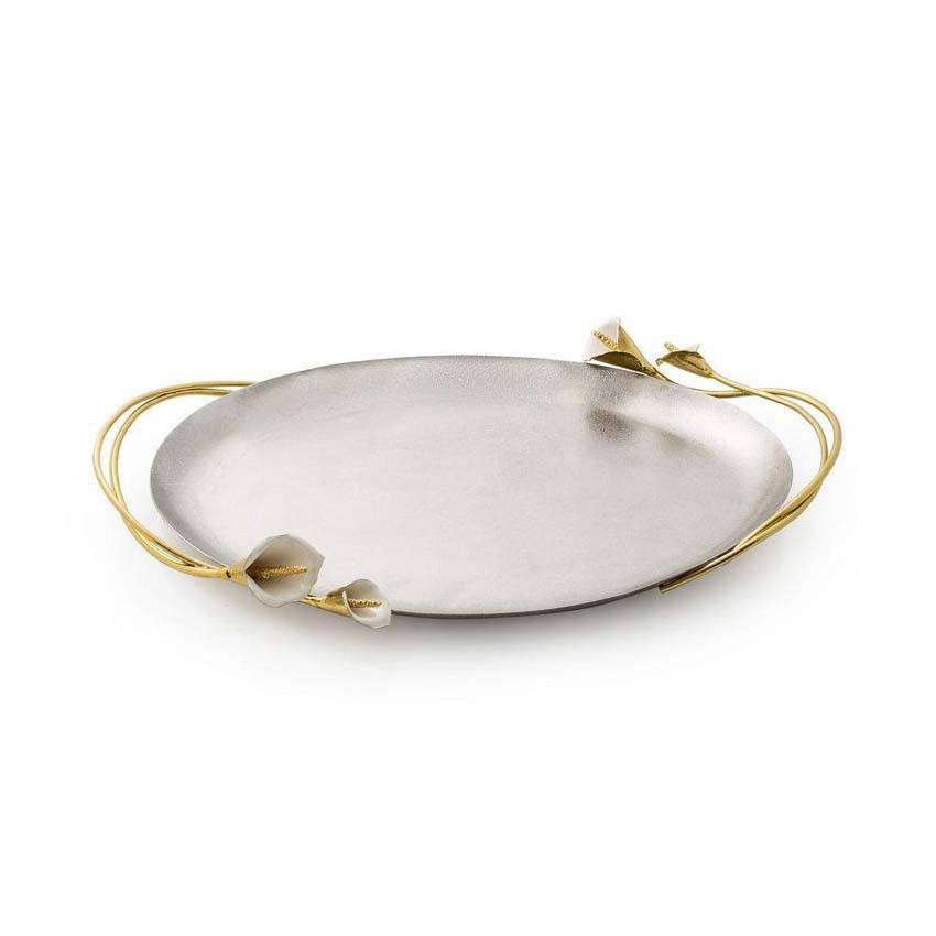 ถาดเสิร์ฟสแตนเลสสตีลทำมือ พร้อมหูจับลายพฤกษศาสตร์เคลือบทอง สำหรับคอลเลกชันเครื่องครัวระดับพรีเมียม