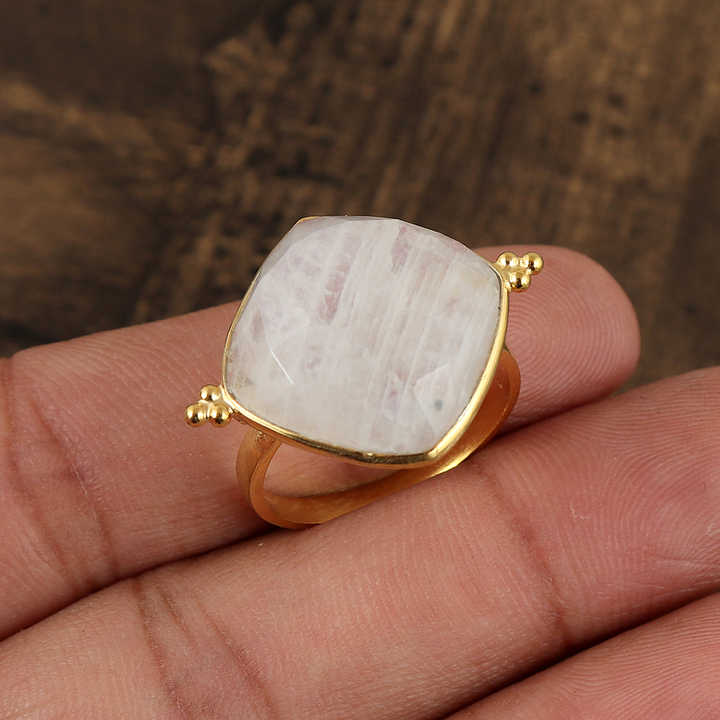 แหวนมูนสโตนทรงคุชชั่นประดับขอบทอง | พลอยคาโบชองสีขาว เครื่องประดับเรียบหรู ดูดี เป็นของขวัญสำหรับผู้หญิง