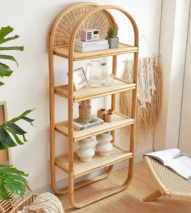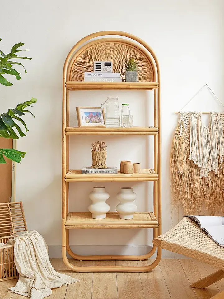ชั้นหนังสือหวายทรงสูงทำด้วยมือสไตล์โบฮีเมียนชั้นวางจัดแสดงแบบเรียบง่ายและจัดเก็บของสำหรับห้องนั่งเล่น