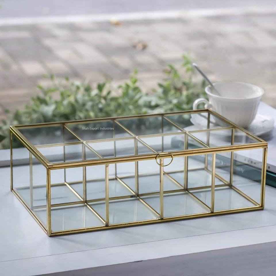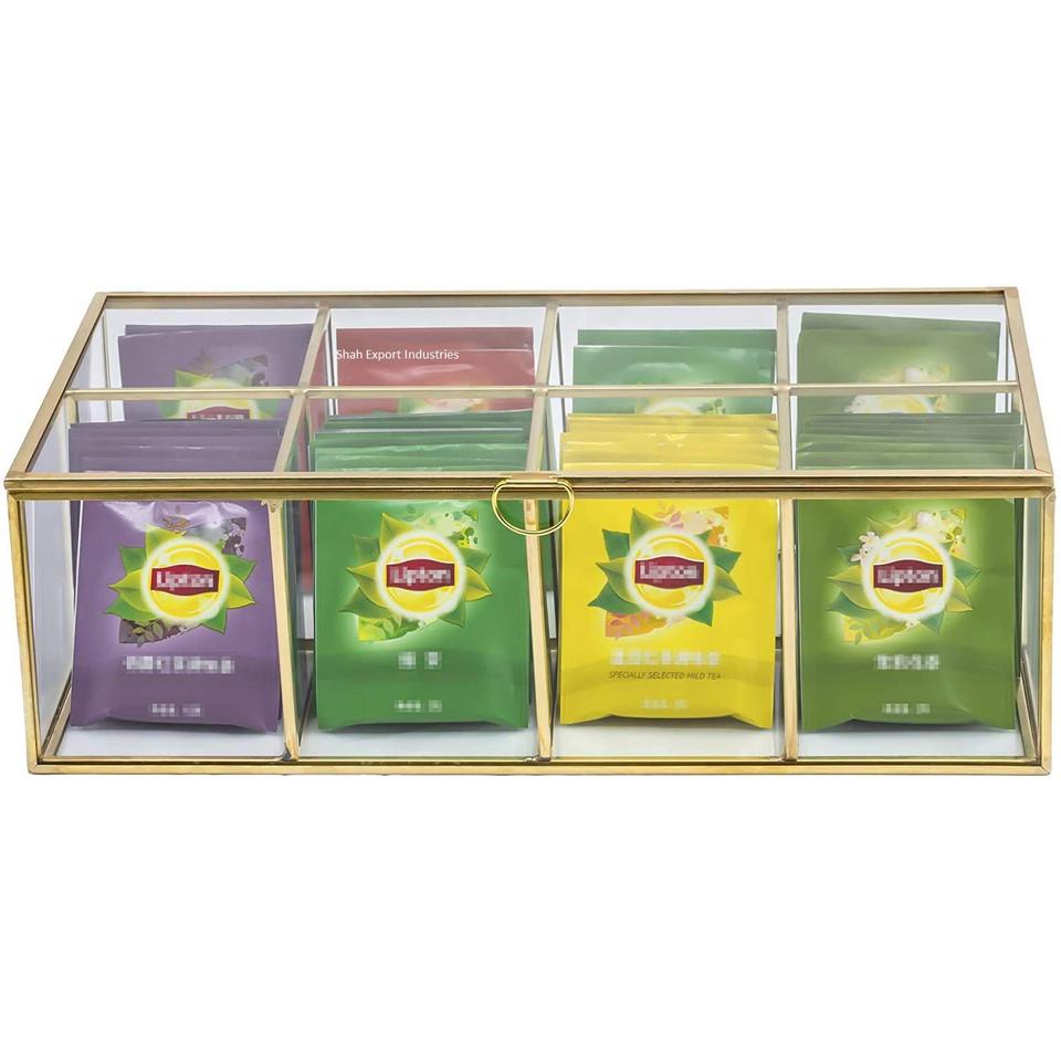 Handcrafted Tea Bag Organizer Brass and Glass Box Sugar Coffee Tea Packets Storage Box 8 Compartments Storage Box