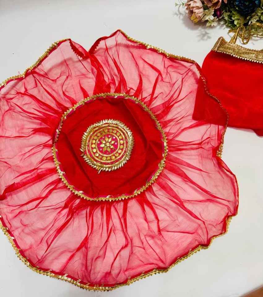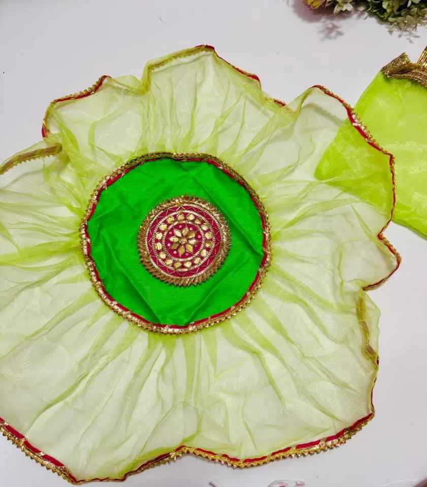 เคสแทลอลทำมือพร้อม Gota patti Work Diwali thalposh พระเจ้ารูปปั้น aasan โต๊ะวางกลาง prasad shagun ผ้าห่อของขวัญ