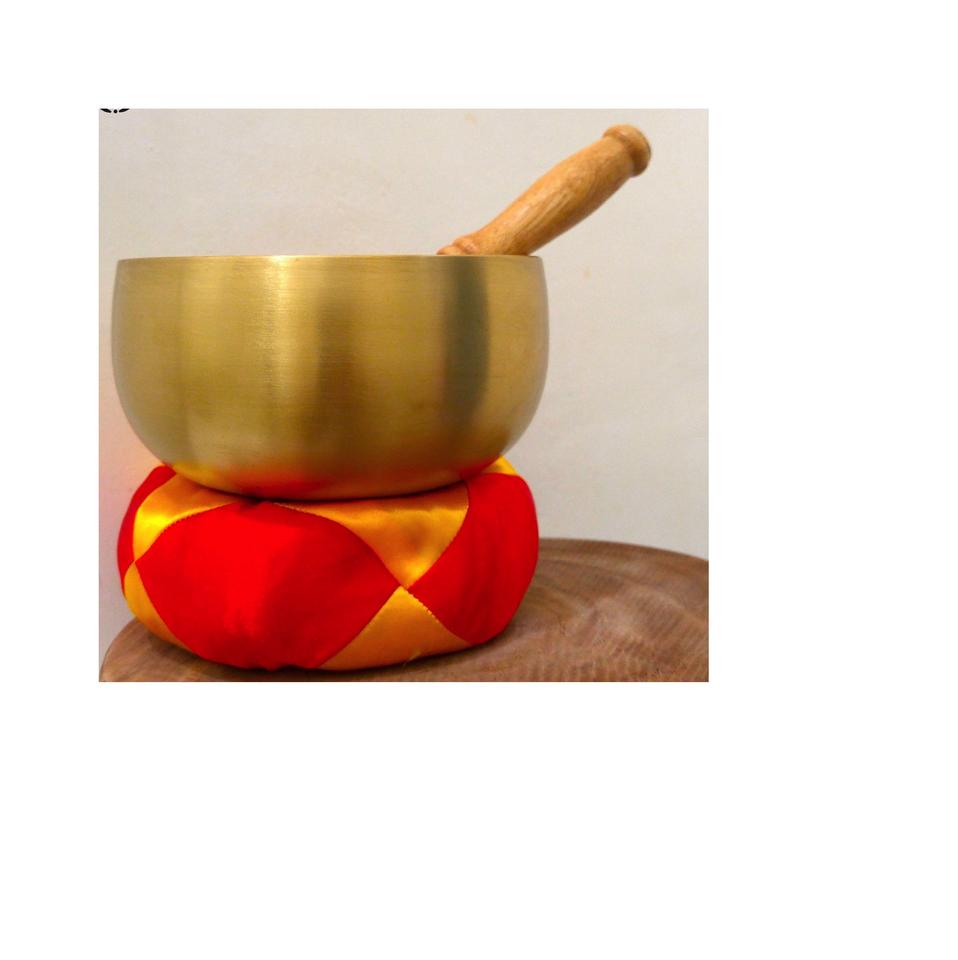 ชามทองเหลืองทำจากโลหะทิเบต,ชามร้องเพลงสีทองพร้อมแผ่นรองไม้และเบาะสำหรับปรับสมดุลจักระ