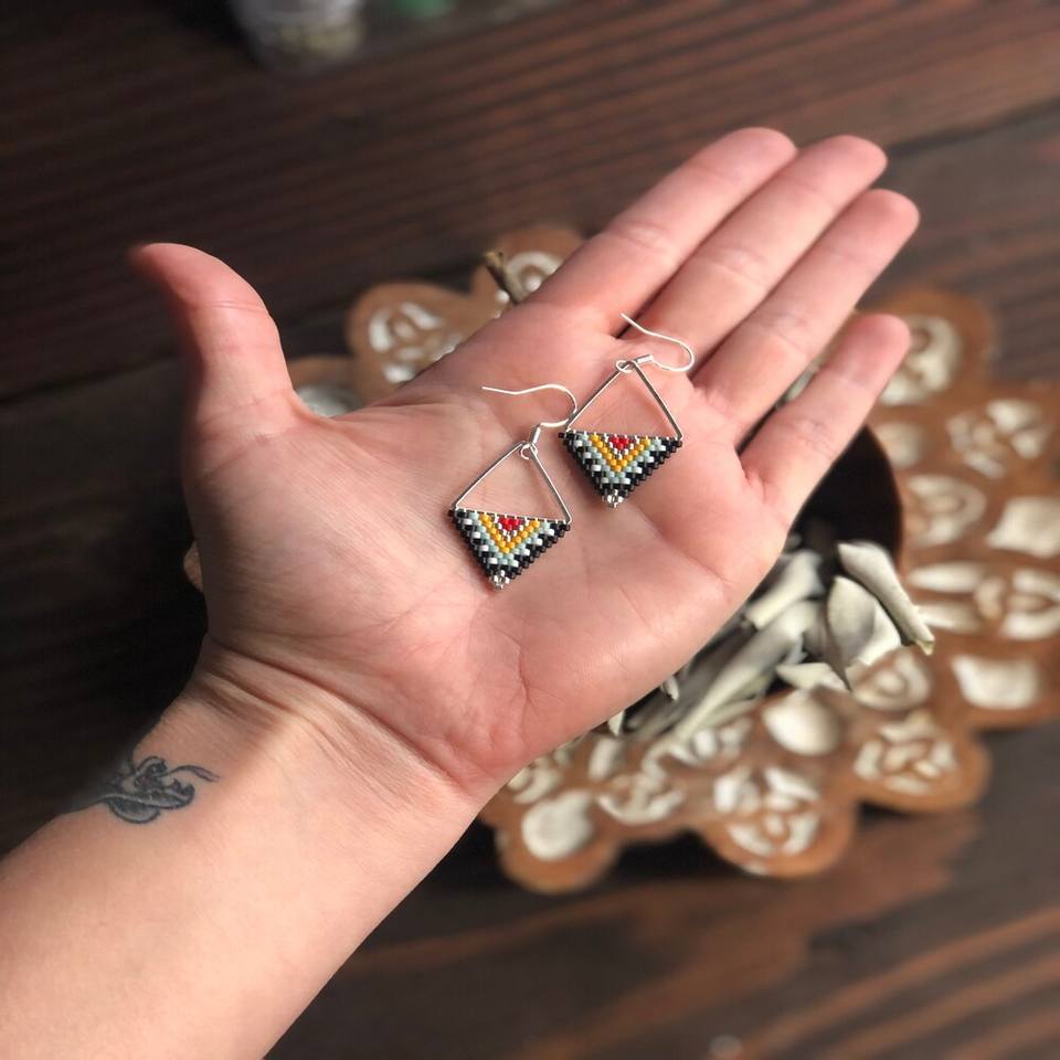 ทำด้วยมือสามเหลี่ยมทองเหลืองชุบทองสีสดใสเมล็ดลูกปัดต่างหูเครื่องประดับอินเทรนด์สำหรับผู้หญิงและเด็กผู้หญิงสวมใส่ในโอกาส
