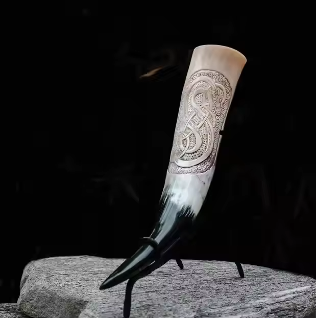 ฮอร์นสำหรับดื่มแบบไวกิ้งทำมือเขาดื่มขัดเงาพร้อมซองหนังโดยงานฝีมือรูปพระจันทร์เสี้ยว