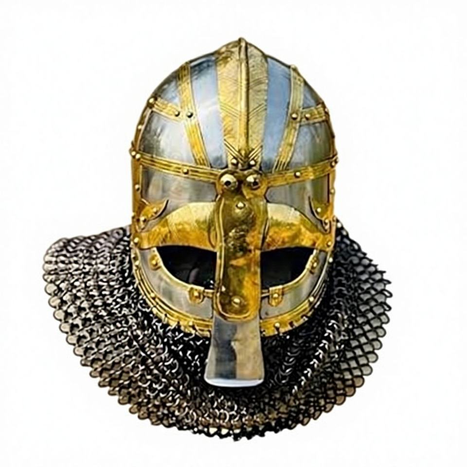 หมวกนักรบไวกิ้งทำมือแบบดีลักซ์ พร้อมตกแต่งด้วยทองเหลืองและหมวกเหล็กตาข่ายแบบมีที่ครอบจมูก สำหรับคอสเพลย์ การแสดงบทบาทสมมติ และการจัดแสดง