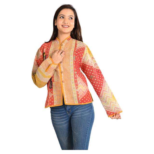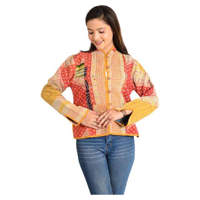 เสื้อแจ็คเก็ตผ้าฝ้ายคันธาทำมือสไตล์วินเทจ เป็นมิตรกับสิ่งแวดล้อม แบบสองด้าน ผ้าควิลท์ โบโฮชิค เสื้อคลุมสำหรับฤดูใบไม้ร่วง/ฤดูหนาว ลายดอกไม้ พิมพ์ลายทั่วตัว