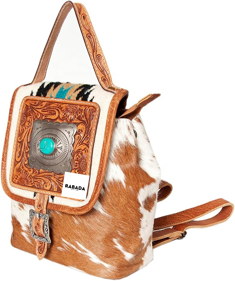 กระเป๋าเป้สะพายหลังหนังแท้พิมพ์ลายวัวสีเทอร์ควอยส์แบบตะวันตกทำมือมีซิปกันขโมยโพลีเอสเตอร์ขายดี
