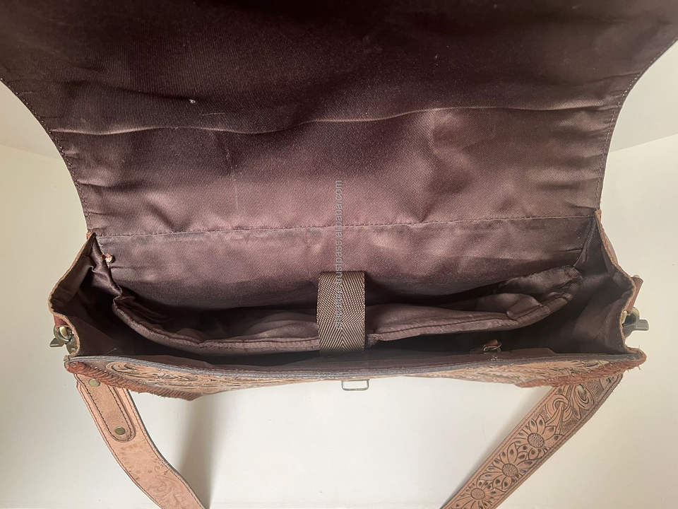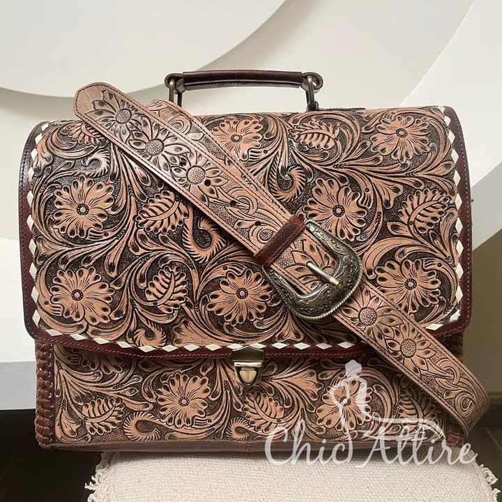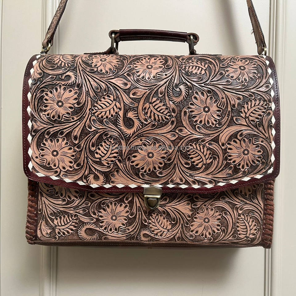 Handcrafted Western Tooled Leather Briefcase Genuine Leather Buck Stitch Work Bag for Women Concealed Carry Crossbody Laptop Bag
