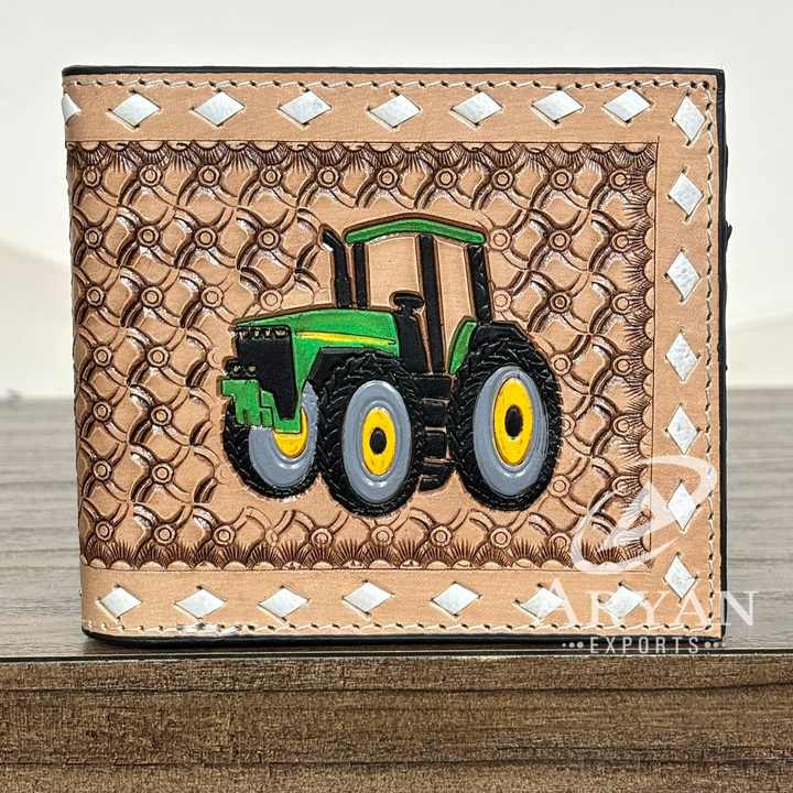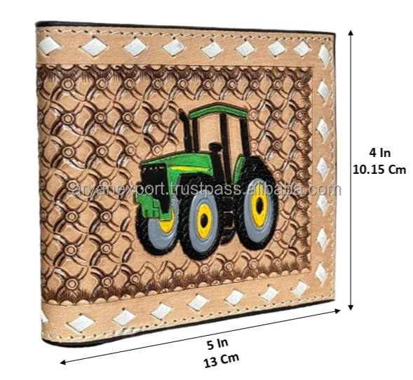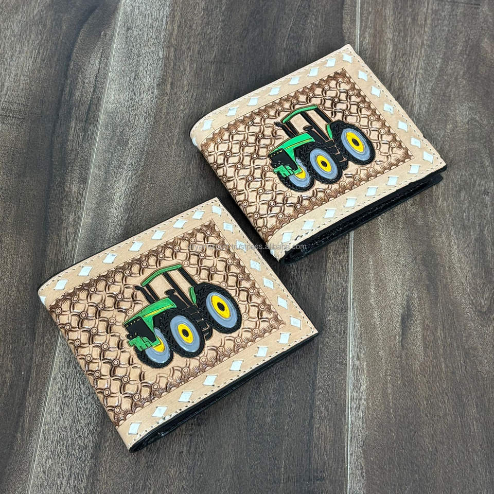 กระเป๋าสตางค์หนังแท้สไตล์ตะวันตก งานแฮนด์เมด ลายฉลุรถแทรกเตอร์ ช่องใส่บัตรหลายช่อง และช่องซิป กระเป๋าสตางค์แบบพับสองตอน ทนทาน