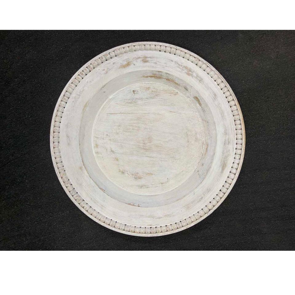 จานรองไม้ประดับลูกปัดสีขาวทำมือ | แผ่นรองจานทรงกลมสไตล์วินเทจ ทำจากไม้เคลือบผิวแบบโบราณ สำหรับโรงแรมและร้านอาหาร