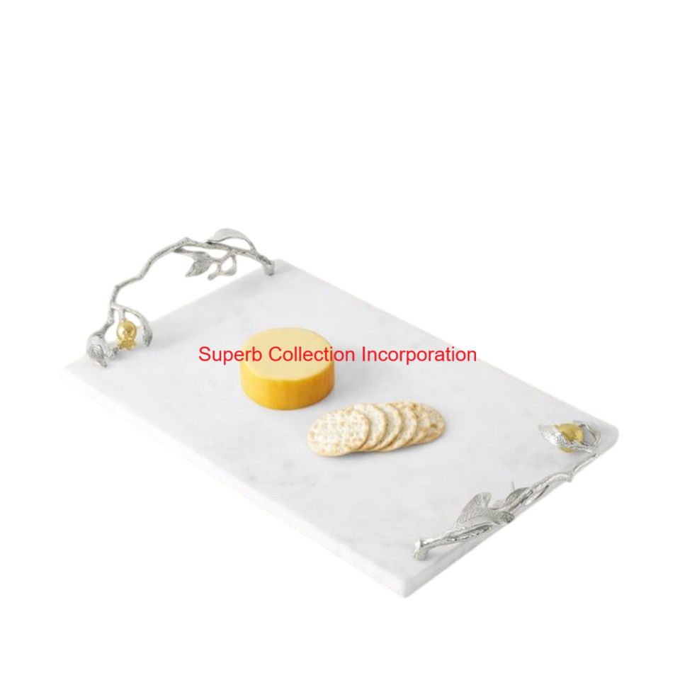 บอร์ดชีสหินอ่อนสีขาวทำด้วยมือพร้อมด้ามจับโลหะดีไซน์ทับทิมหรูหราถาดเสิร์ฟแบบพรีเมี่ยมสำหรับตกแต่งบ้าน