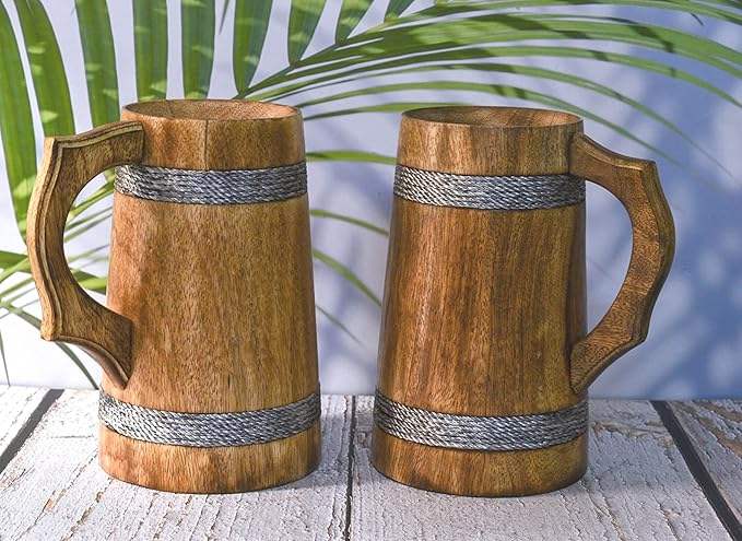 ชุดแก้วเบียร์ทำด้วยมือพร้อมถาดไม้แบบชนบทพร้อมที่จับและสายโลหะ