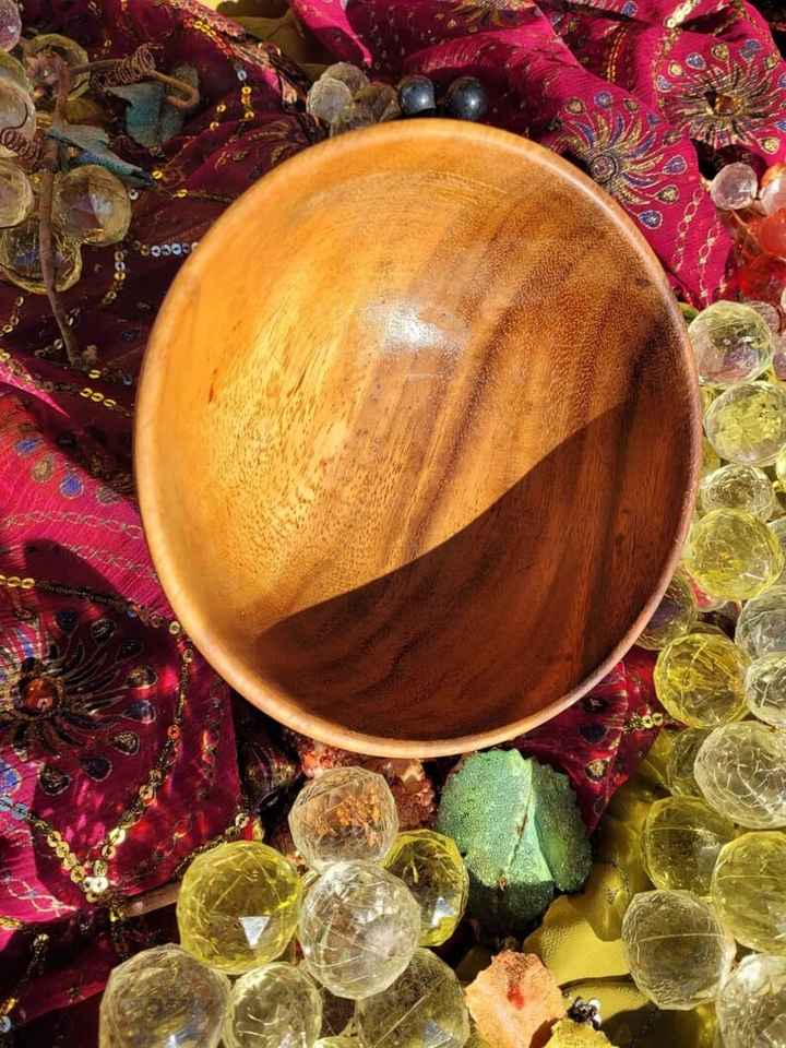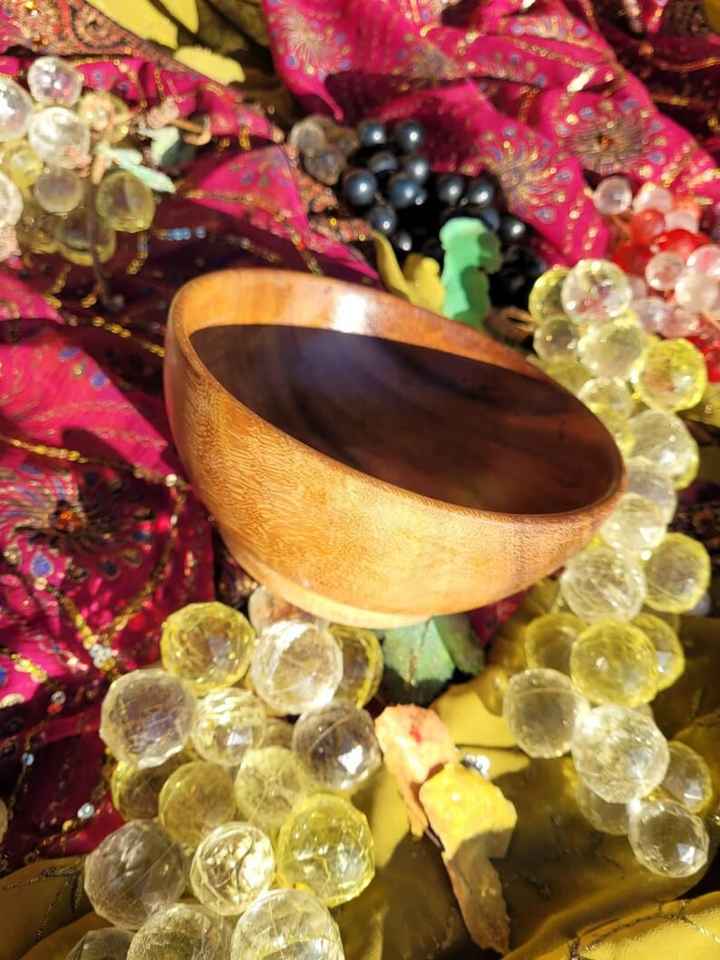 ชามไม้ทำด้วยมือ | ล้อมรอบด้วยผ้าลวดลายสดใสและลูกปัดตกแต่งเป็นประกายท่ามกลางแสงแดดสีทองอบอุ่น