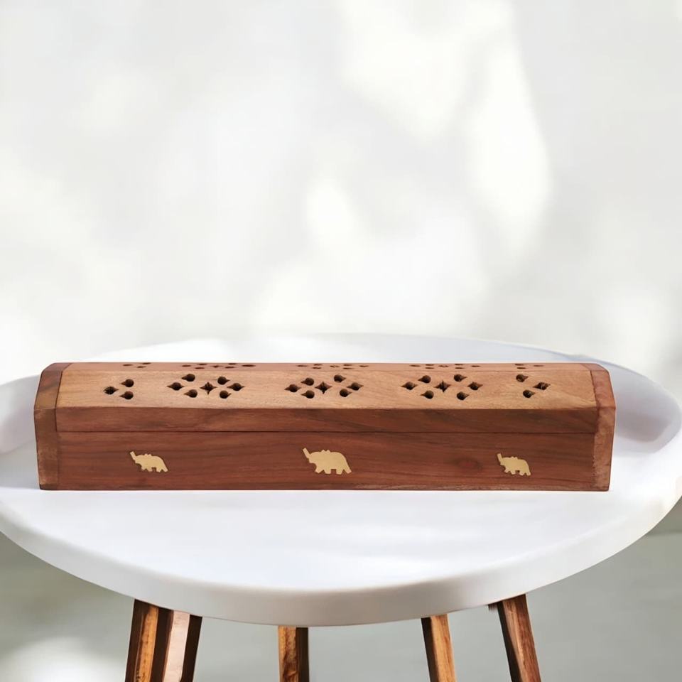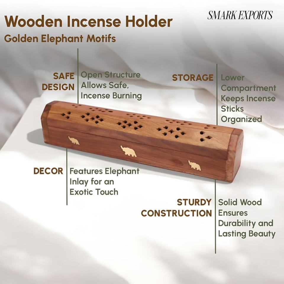 กล่องใส่ธูปไม้แกะสลักลายช้างแบบดั้งเดิม ดีไซน์ลายฉลุ ระบายอากาศได้ดี เป็นมิตรกับสิ่งแวดล้อม ทนทาน สำหรับการเผาธูปแบบสะอาด