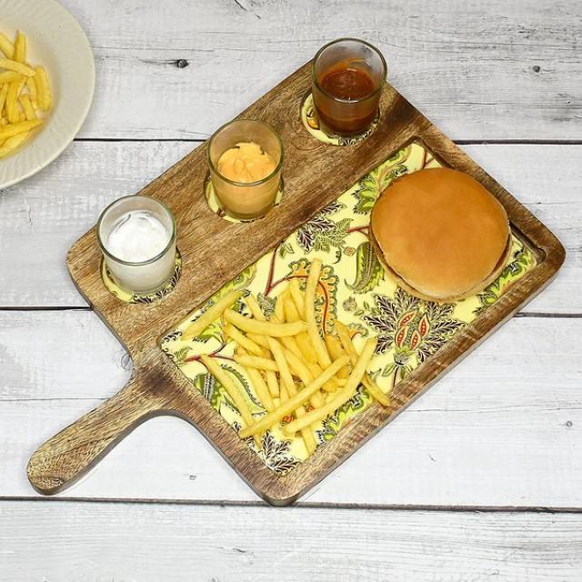 ถาดเสิร์ฟไม้ทำด้วยมือพร้อมที่จับจานใส่อาหารเรียกน้ำย่อยดีไซน์ดอกไม้เป็นเอกลักษณ์สำหรับงานปาร์ตี้เครื่องใช้บนโต๊ะอาหารลวดลายไม่เหมือนใครทำจากไม้