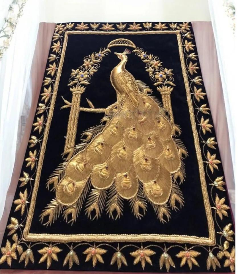 ผ้าปูพื้นงานฝีมือปักลายซาร์โดซี งานปักละเอียดประณีต ลายยูงสดใส ประดับด้วยอัญมณีกึ่งมีค่าสำหรับบ้านที่หรูหรา