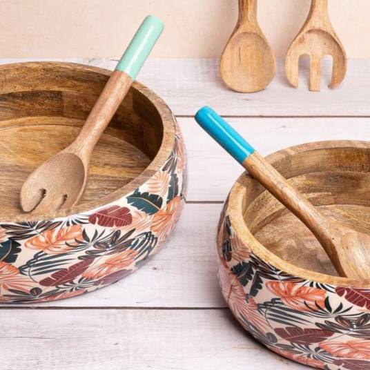 ชามเสิร์ฟทำจากไม้ทำมือพร้อมช้อนเสิร์ฟดีไซน์เคลือบหลายใบขายดีสำหรับเสิร์ฟผลไม้ในบ้านและปาร์ตี้