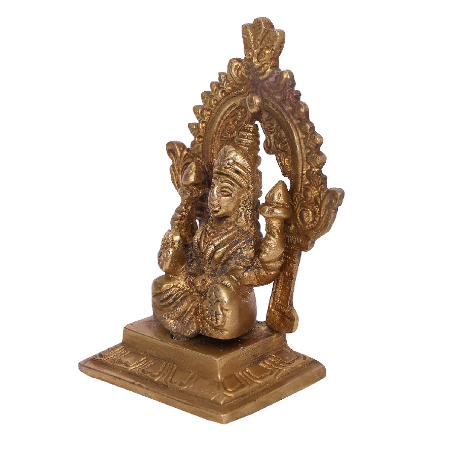 รูปปั้นเทพีลักษมีทองเหลืองโบราณเคลือบเงา งานฝีมือแบบดั้งเดิม ของตกแต่งทางจิตวิญญาณสำหรับบ้านและวัด งานหัตถกรรมอินเดีย