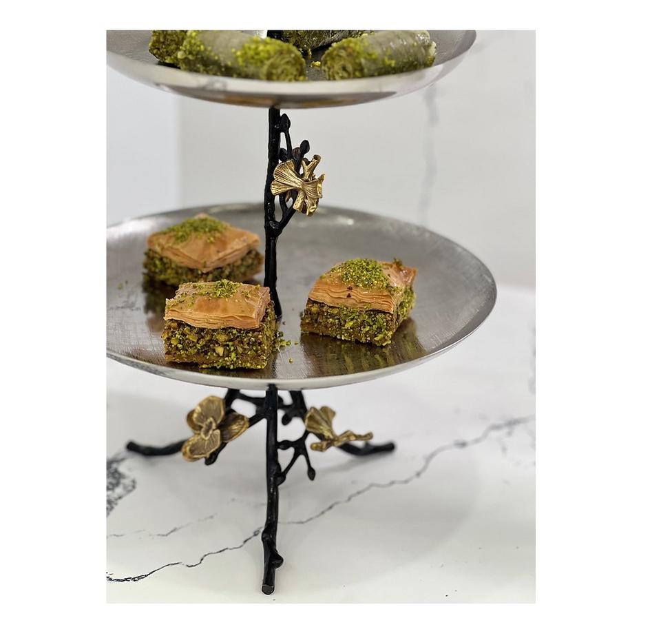 ถาดจานและจานจานทำจากทองเหลืองมีลายดอกไม้ทำจากสเตนเลสสตีลขาตั้งชามสลัดผลไม้และถั่ว