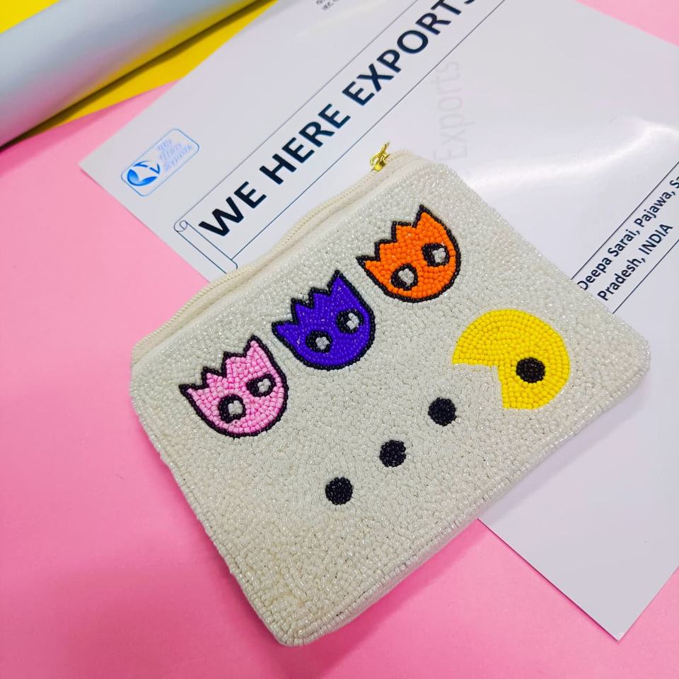 กระเป๋าถือทำมือจากผ้าฝ้าย 100% ประดับลูกปัด ลายเกม Pac-Man ดีไซน์ผีหลากสีสัน พร้อมซิปทนทานสำหรับจัดเก็บ